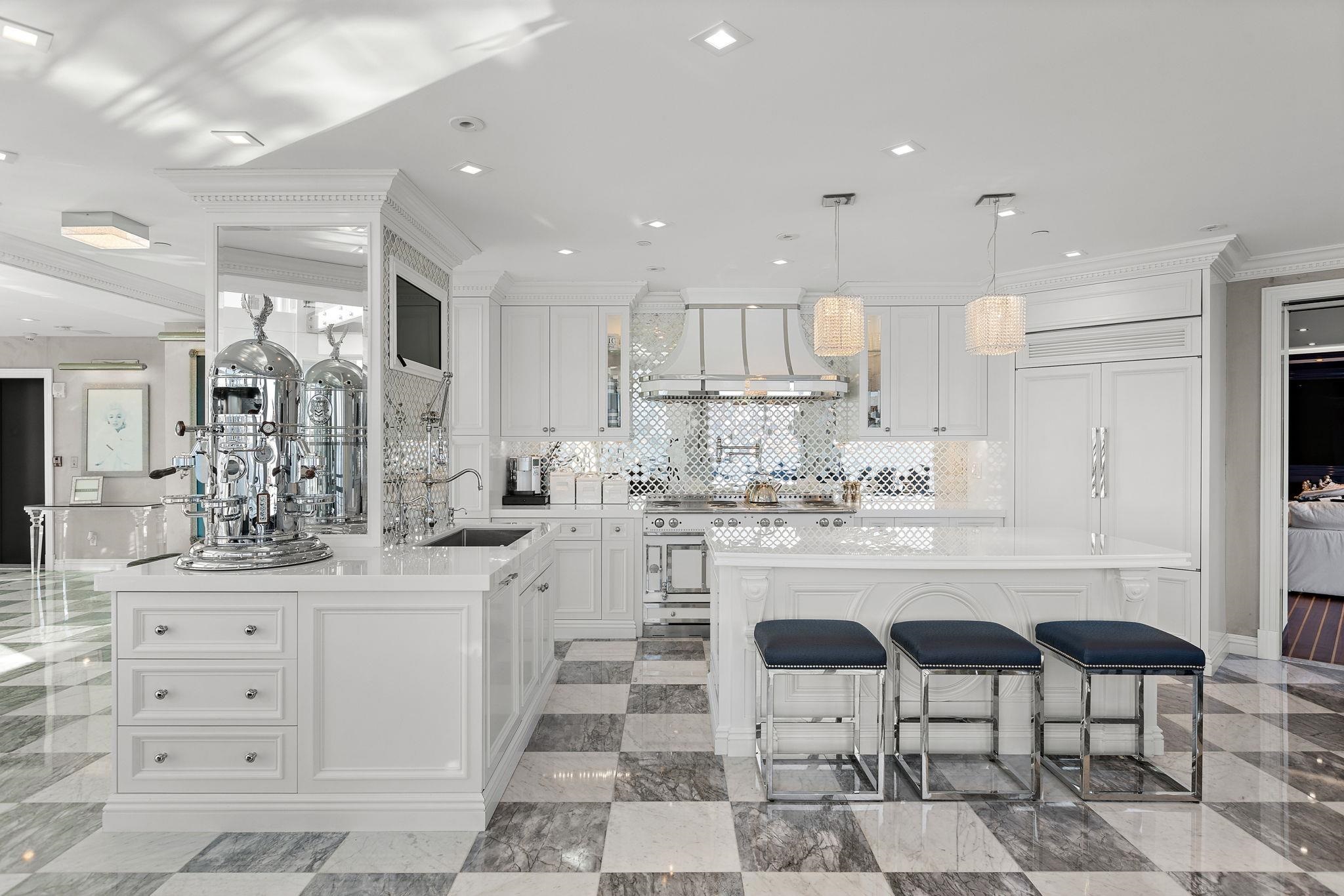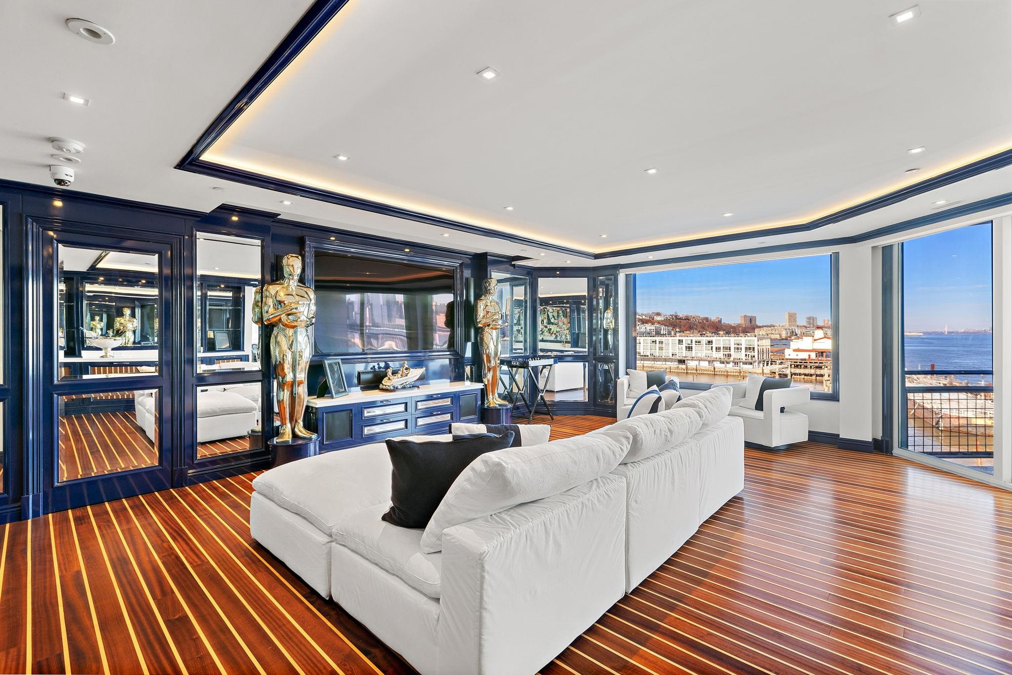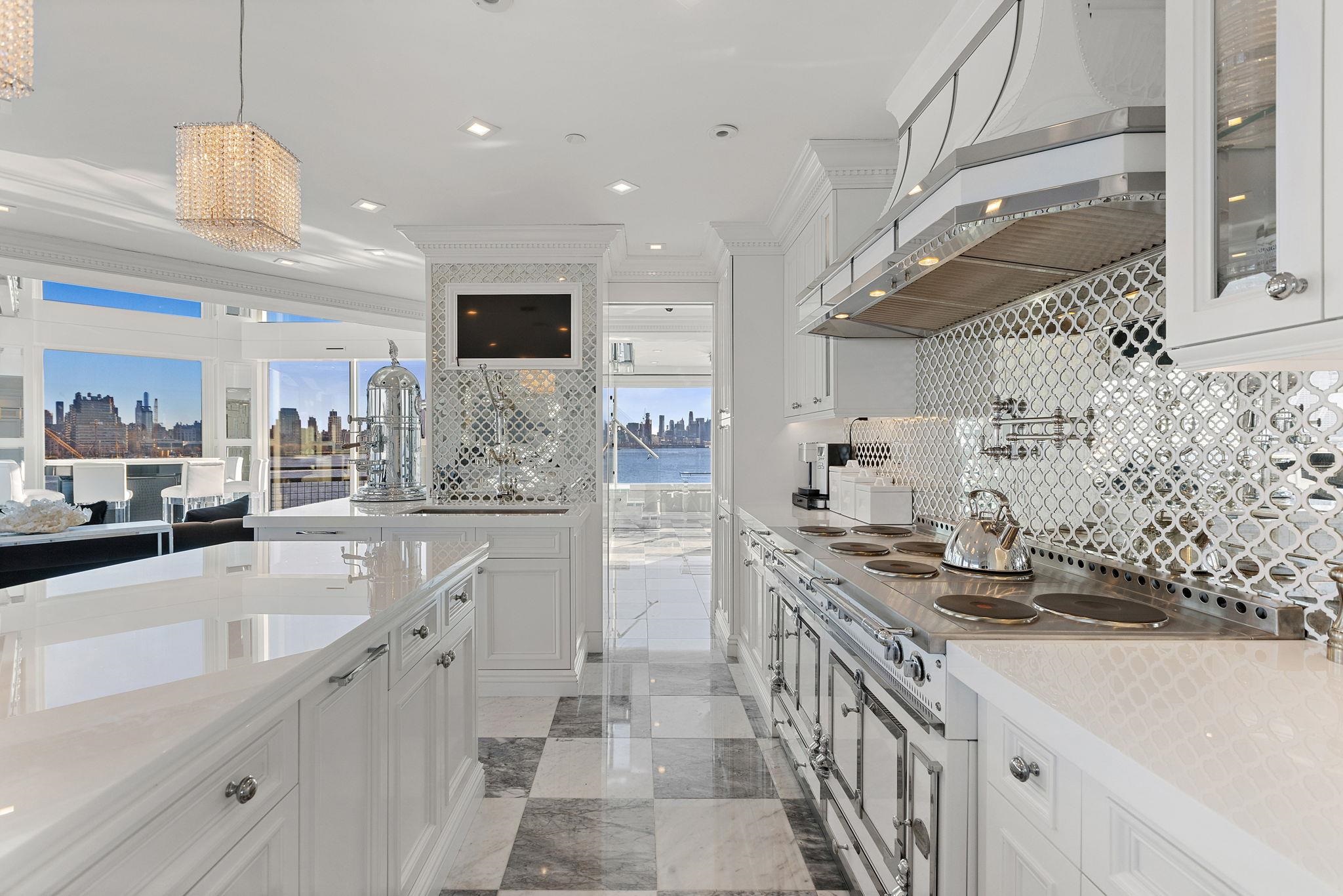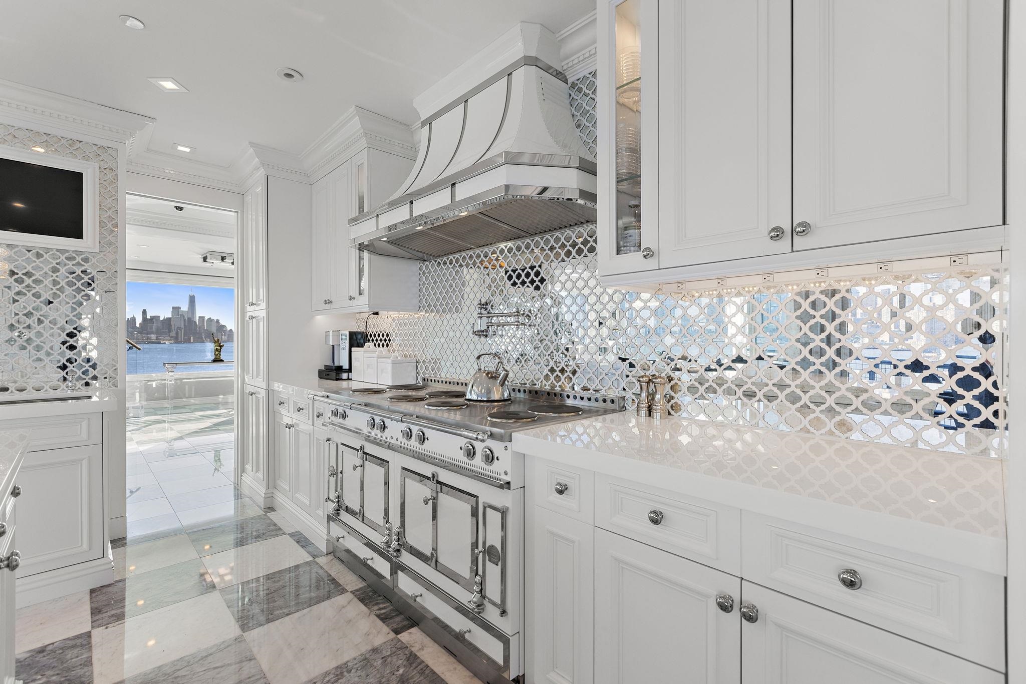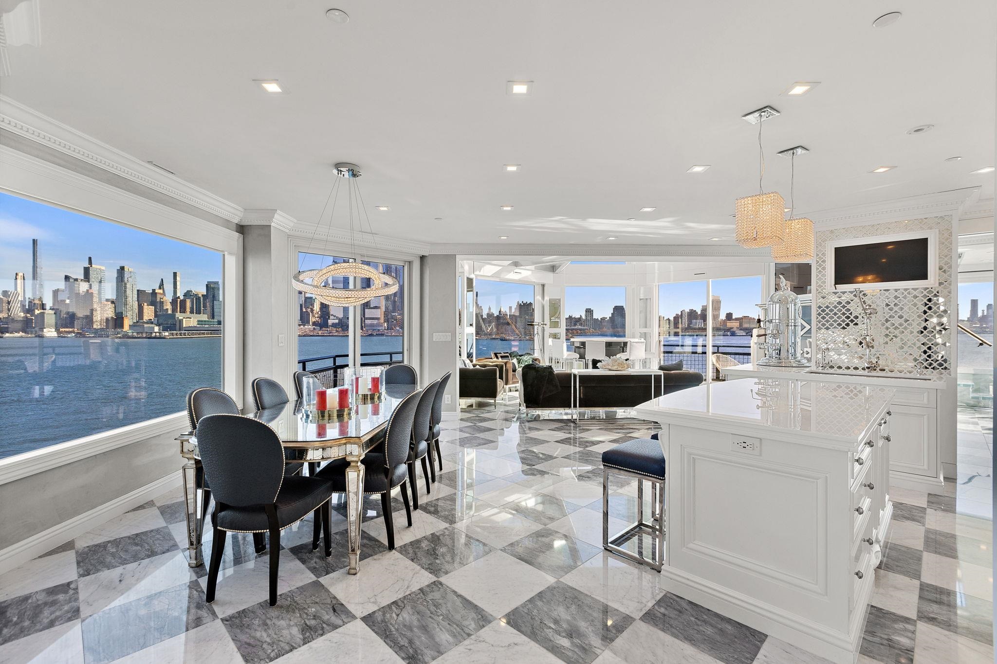 Stunningly unique 2-story penthouse in the sky with breathtaking panoramic NYC & Hudson River views! Step off your private elevator to see gorgeous south NYC views and a custom glass staircase with built-in wine storage. Walk into the heart of the home and be surrounded by the entire NYC skyline: this 2-story great room has a bar, custom fireplace, and balcony, while allowing you to see all the way from the George Washington Bridge to the Verrazano Bridge. Turn around and you’re in your spacious chef’s kitchen with white cabinetry and countertops, custom sink with instant hot water, oversized island and LaCornue stove with 8 burners and a pot filler. The dining area has incredible northern views and its own balcony. The living room has custom paneling and storage, a wet bar with a dishwasher and freezer, and an additional balcony with stunning views. The upstairs landing is a luxurious custom office space with built-in shelves and a mirrored wall (with a hidden TV) to reflect the incredible views. The expansive primary suite has an attached glass loft over the great room, panoramic views, skylights, a fireplace, walk-in closet, and a enormous ensuite bathroom with its own views over dual sinks, an enormous soaking tub, and walk-in shower with four showerheads. To round out this incredible home, it has 3 additional bedrooms, each huge, with NYC/river views, unique custom ensuite bathrooms, and walk-in closets. This home was completely redone with all new systems, radiant heat flooring, Sonos Bluetooth throughout, and hurricane impact windows. Included is the NEST thermostat, electronic sun window shades, private storage and 2 garage parking spaces. The luxury community of Riva Pointe offers 24/7 concierge and security, an indoor pool, fitness center, sauna, sundecks, and landscaped terraces. Sitting just steps from the NYC Ferry terminal as well as buses, light rail, the Lincoln Tunnel, and Whole Foods, this is one of the finest locations on the entire Gold Coast waterfront.