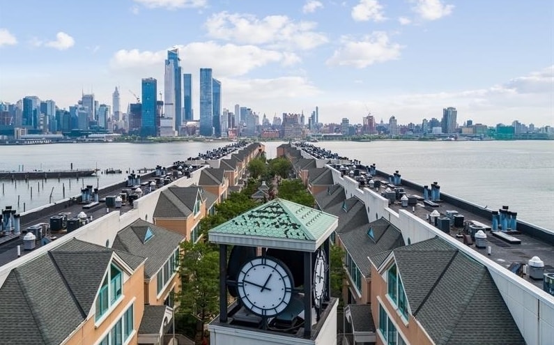 Beautifully renovated 2-Bedroom, 2.5-Bath townhouse-style residence in the prestigious community of Riva Pointe. This waterfront home in Weehawken offers stunning views of the Manhattan skyline and Hudson River, blending modern elegance with comfort. The open-concept living area features wood floors, a wood-burning fireplace, and large windows that fill the space with natural light. The gourmet kitchen is complete with granite countertops, stainless steel appliances, and rich wood cabinetry — perfect for both cooking and entertaining. The spacious primary suite includes a large walk-in closet and a spa-inspired en-suite bath with vanity and shower. The second bedroom also features a bathtub, providing comfort and privacy for guests or family. Enjoy your morning coffee with the beautiful sunrise from your private balcony overlooking the water on the Gold Coast. Additional highlights include in-unit washer/dryer, central A/C, and one garage parking space. Riva Pointe offers luxury amenities such as a 24-hour concierge, indoor heated pool, fitness center, and waterfront promenade. Ideally located steps from the NY Waterway Ferry, Light Rail, and major bus lines — with shopping, dining, and Whole Foods nearby — this home delivers the ultimate blend of convenience and lifestyle on the Hudson waterfront.