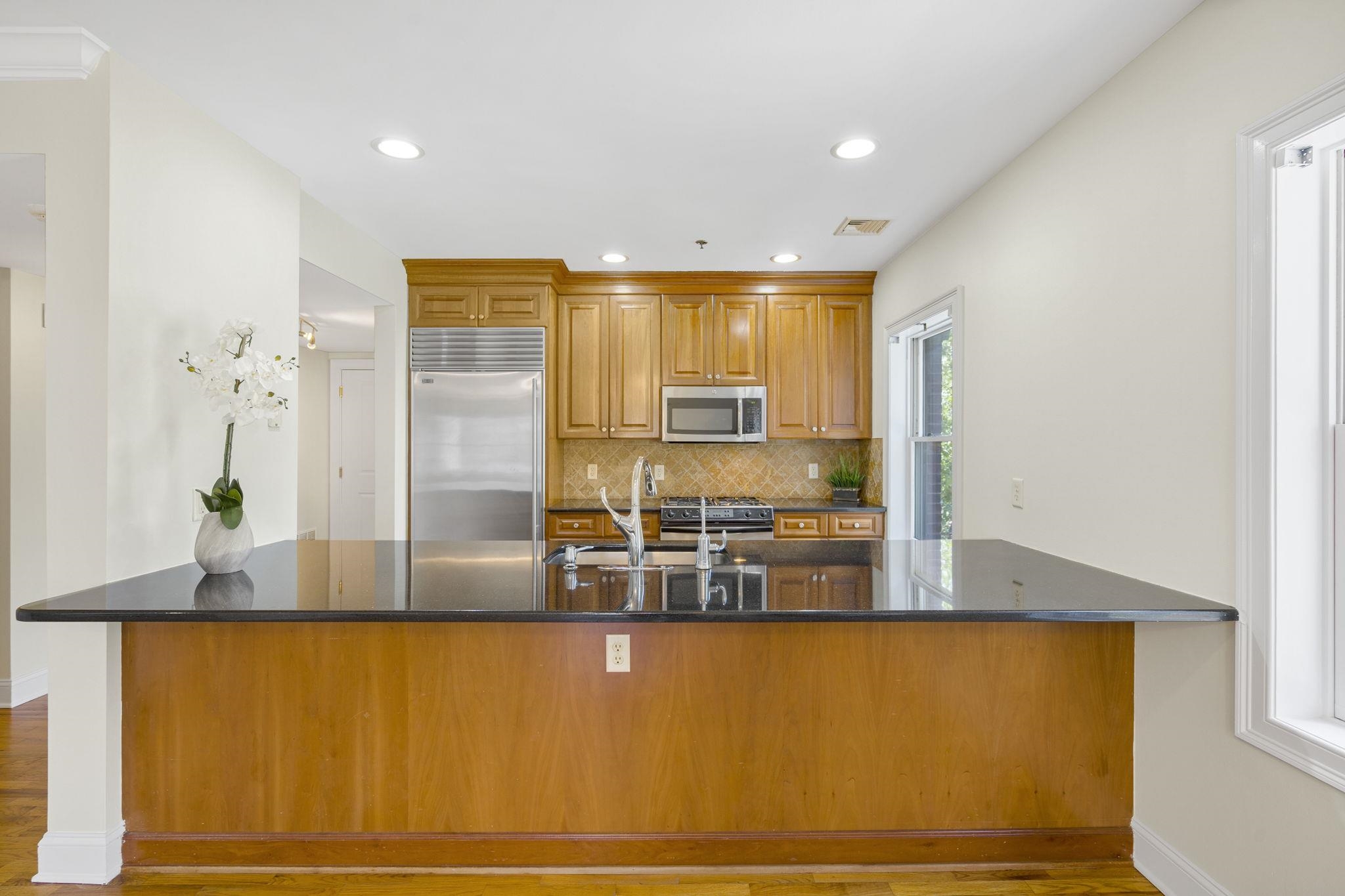 Located on one of Paulus Hook’s most desirable historic streets, this sun-filled 2-bedroom, 2-bath corner home spans approximately 1,100 sq. ft. and is filled with abundant natural light from two full walls of windows, complemented by hardwood floors throughout. The kitchen features high-end stainless-steel appliances including a Sub-Zero refrigerator and Thermador range, granite countertops, and an oversized breakfast bar. The primary suite offers an en-suite bath and custom, professionally built-out closets, while the even larger, oversized second bedroom is ideal for guests or a home office. Additional highlights include central A/C, in-unit washer/dryer, private storage, and deeded garage parking, all within a boutique elevator building offering a shared bike room and backyard garden on a quiet, tree-lined block just minutes to the PATH, ferry, shops, restaurants, parks, schools, and the waterfront boardwalk. Don’t miss this one! Please note: an additional reserve contribution of $464/month per unit is in place and will be reviewed at the Q1 2026 board meeting.