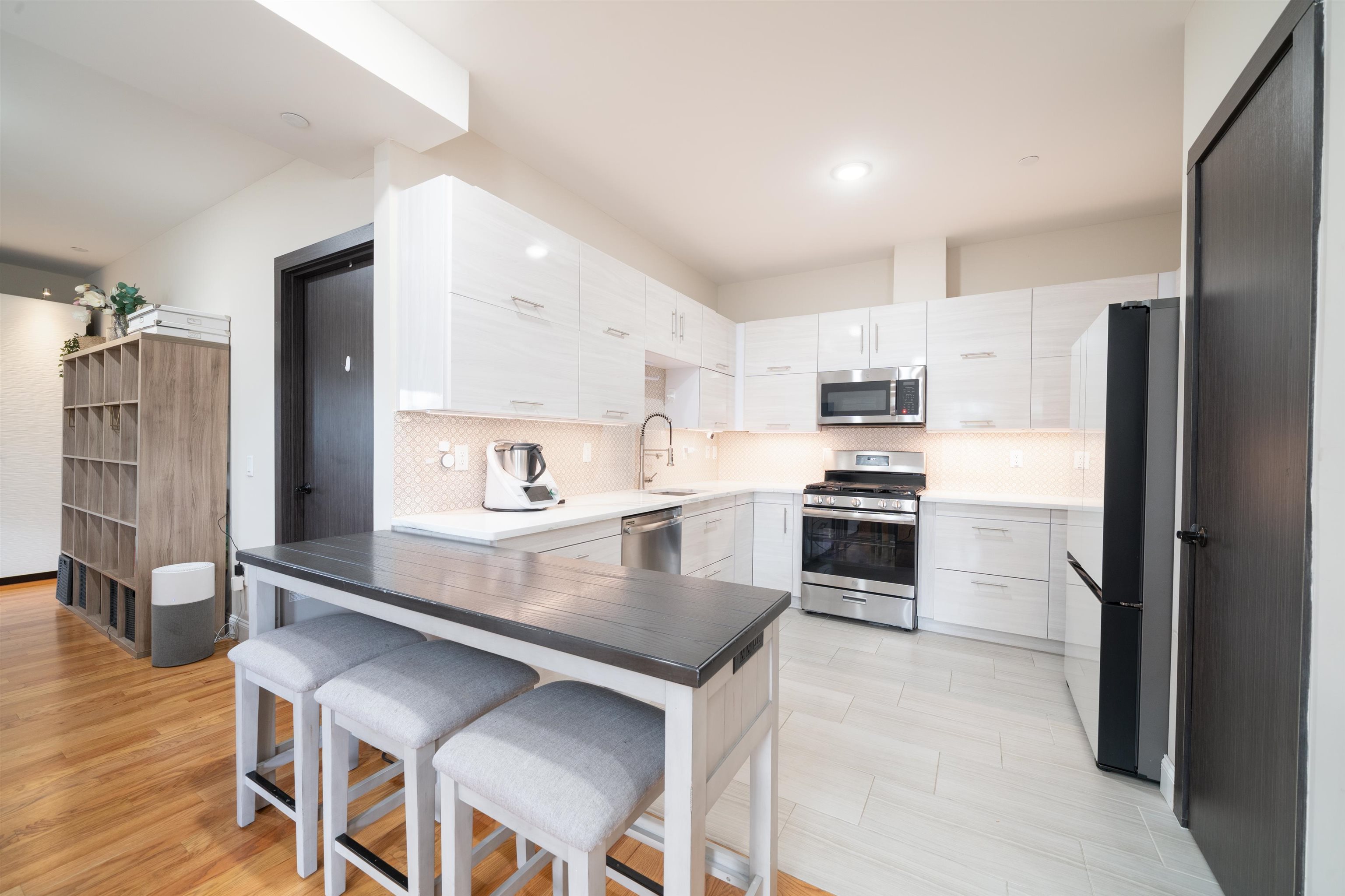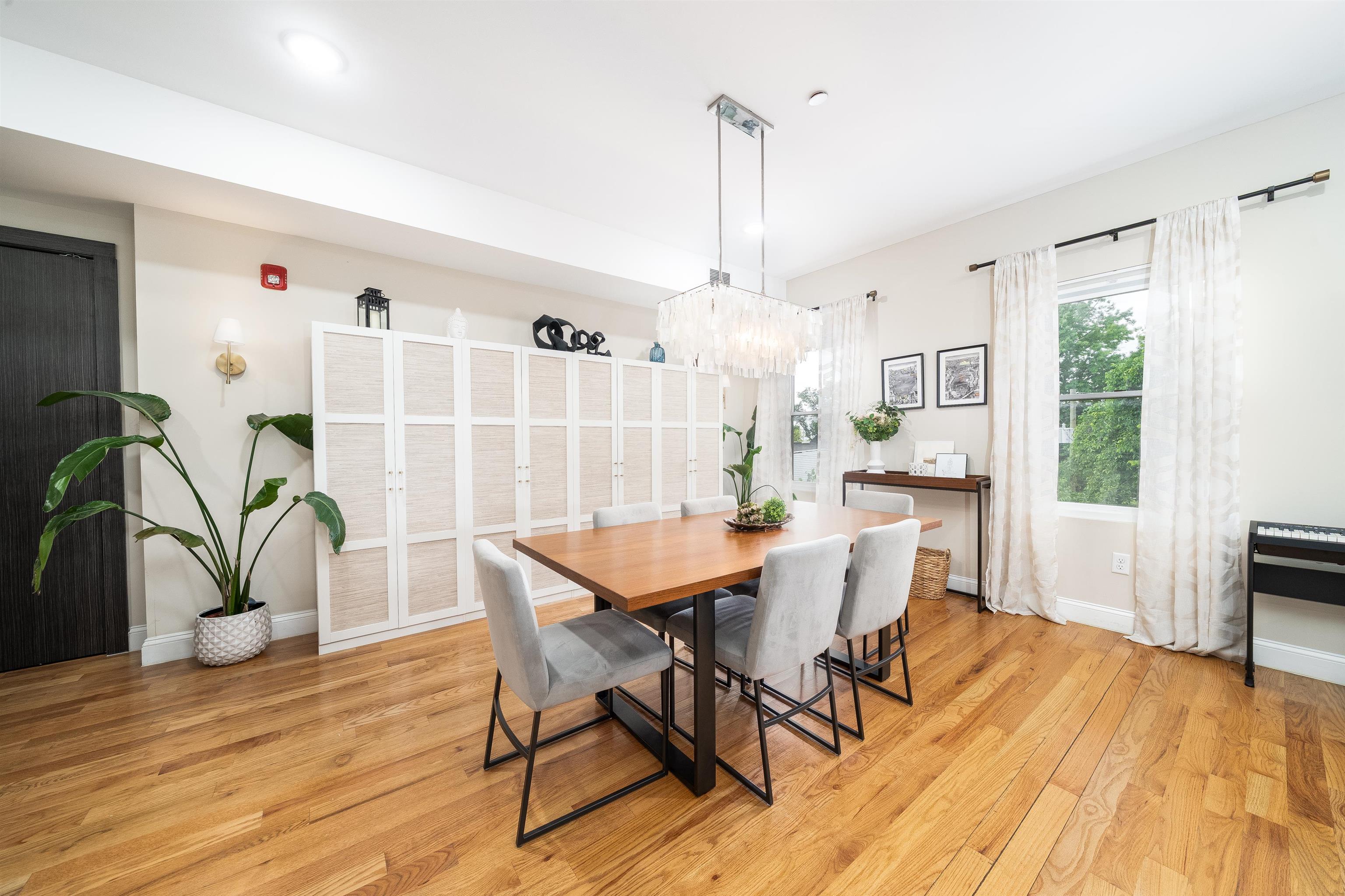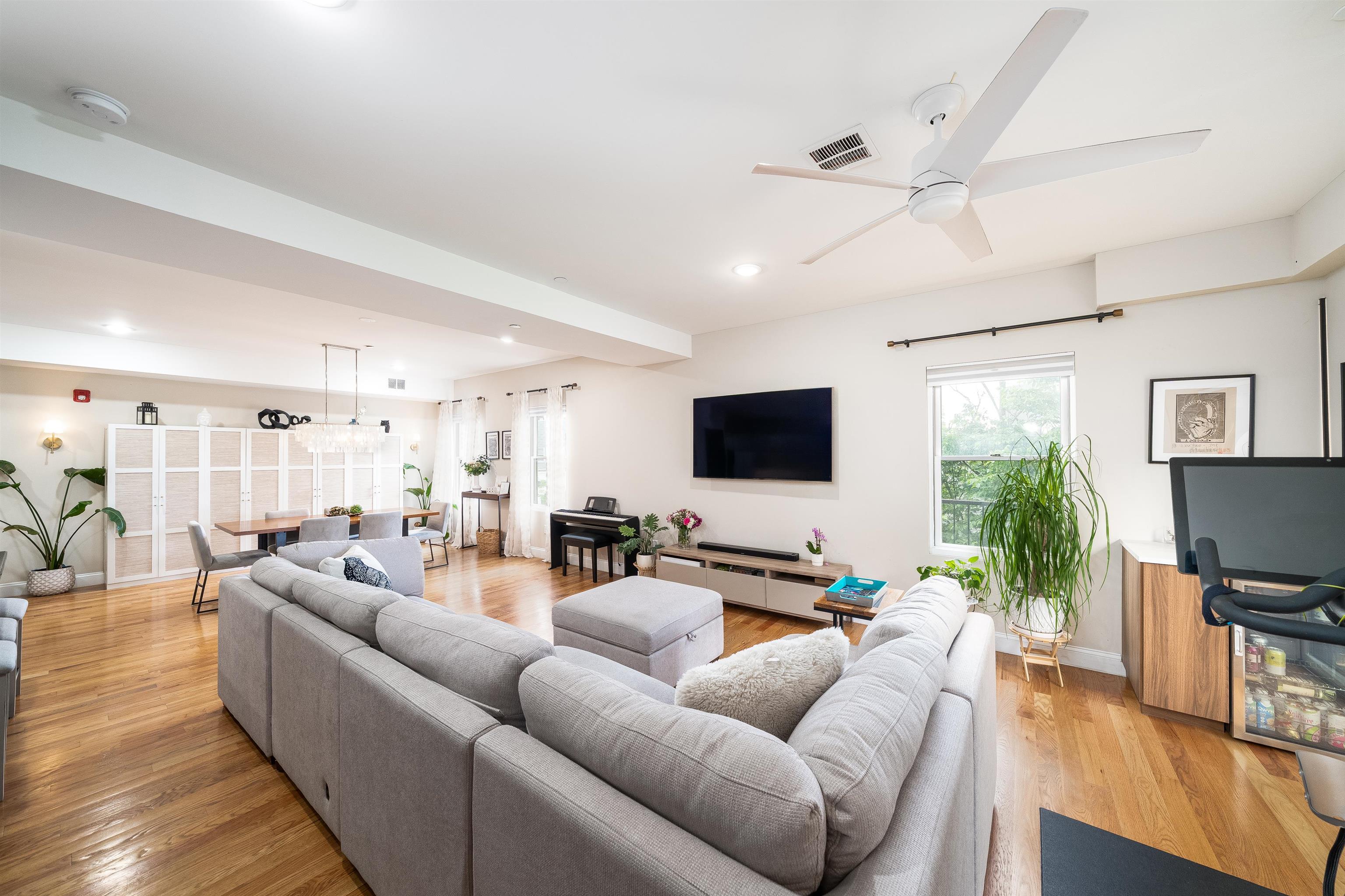 Come see this expansive condominium in a boutique-style building with attractive amenities located in the heart of the McGinley Square neighborhood of Jersey City. This large 2 bedroom 2 bath unit spans over 1400 square feet, featuring an open floor plan, gleaming hardwood floors throughout, sleek custom cabinetry, central air, Quartz countertops, stainless steel appliances, washer & dryer in unit, recessed lighting and remarkable, large bathrooms. This unit also comes with a garage parking spot. The building has elevator access, secured entry, a shared backyard and a gorgeous common rooftop with NYC views. Located in the center of the city just south of Journal Square in McGinley Square which is booming with new restaurants, bars and shops making it a great place to live. A convenient neighborhood where you are close to the JSQ path and Downtown JC but also have easy access to all major highways.
