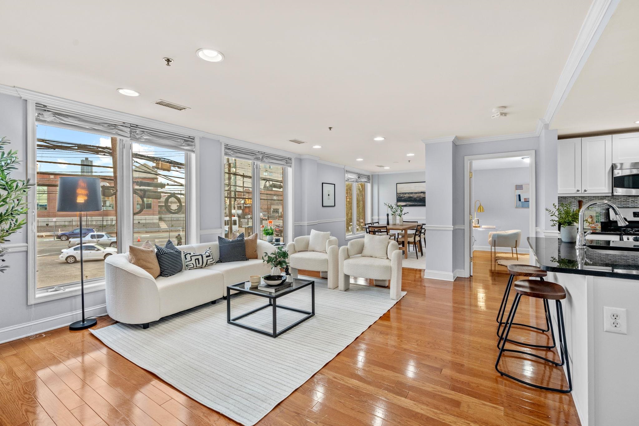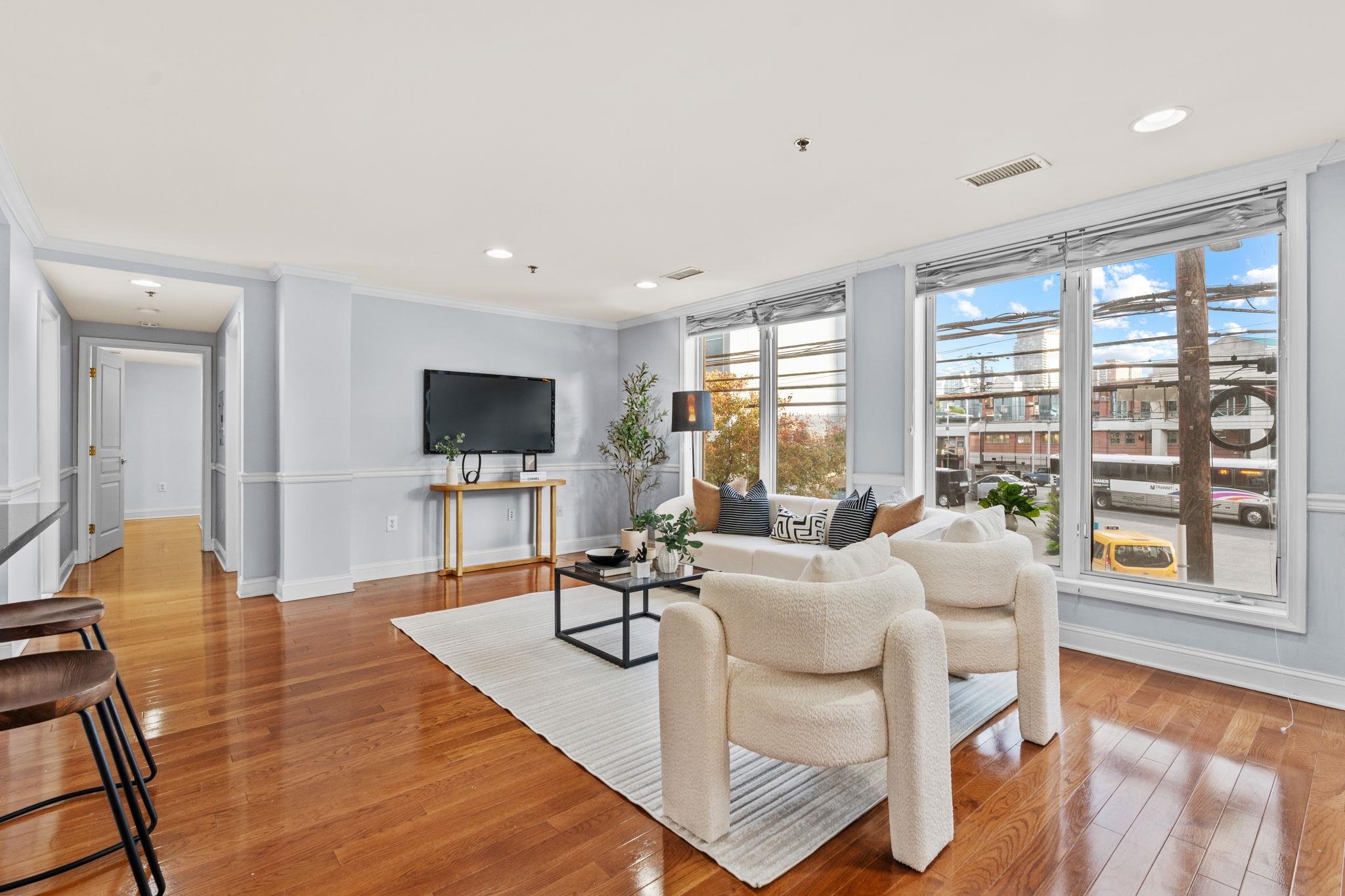 Experience expansive living in this exceptional 3 bedroom (2 bedroom + den), 2-bath home with nearly 1,500 square feet of living space which includes onsite parking in the coveted Oz building-a steel and concrete elevator building set within Hoboken’s downtown location. Welcome to 70 Adams Street! This home welcomes you with dedicated spaces and an airy open-concept design that fills the space with natural light. The generous living and dining area flows seamlessly into a well-appointed kitchen featuring stainless steel appliances, granite countertops, center island with additional seating and abundant cabinetry—perfect for everyday cooking and effortless entertaining. The expansive primary suite provides a peaceful retreat with an ample customized walk in closet plus an additional built in and an en-suite bath with jetted tub. The second bedroom is equally spacious and bright and has easy access to the homes guest bath. The additional den offers valuable flexibility—ideal for a home office, nursery, fitness space, or guest area and features a large closet. Two full bathrooms are thoughtfully designed with modern fixtures and finishes that complement the home’s aesthetic. With hardwood floors throughout, central heating/cooling, new in home laundry, recessed lighting and a wall of windows-this perfect home is waiting for your personal touch to compliment your personality and needs. Seventy Adams is a steel & concrete corner building that offers access to elevator service, a fitness center and secure Butterfly MX intercom system that delivers a lifestyle of comfort and convenience. It’s desirable downtown location places you close to boutique cafés, shops, parks, the Southwest Resiliency Park, and easy NYC transportation via bus, PATH, or ferry-PLUS the new upcoming Dumbo Market. 70 Adams Street #2L is a rare Hoboken offering—spacious, versatile, and perfectly situated for elevated urban living. Don’t miss this one!