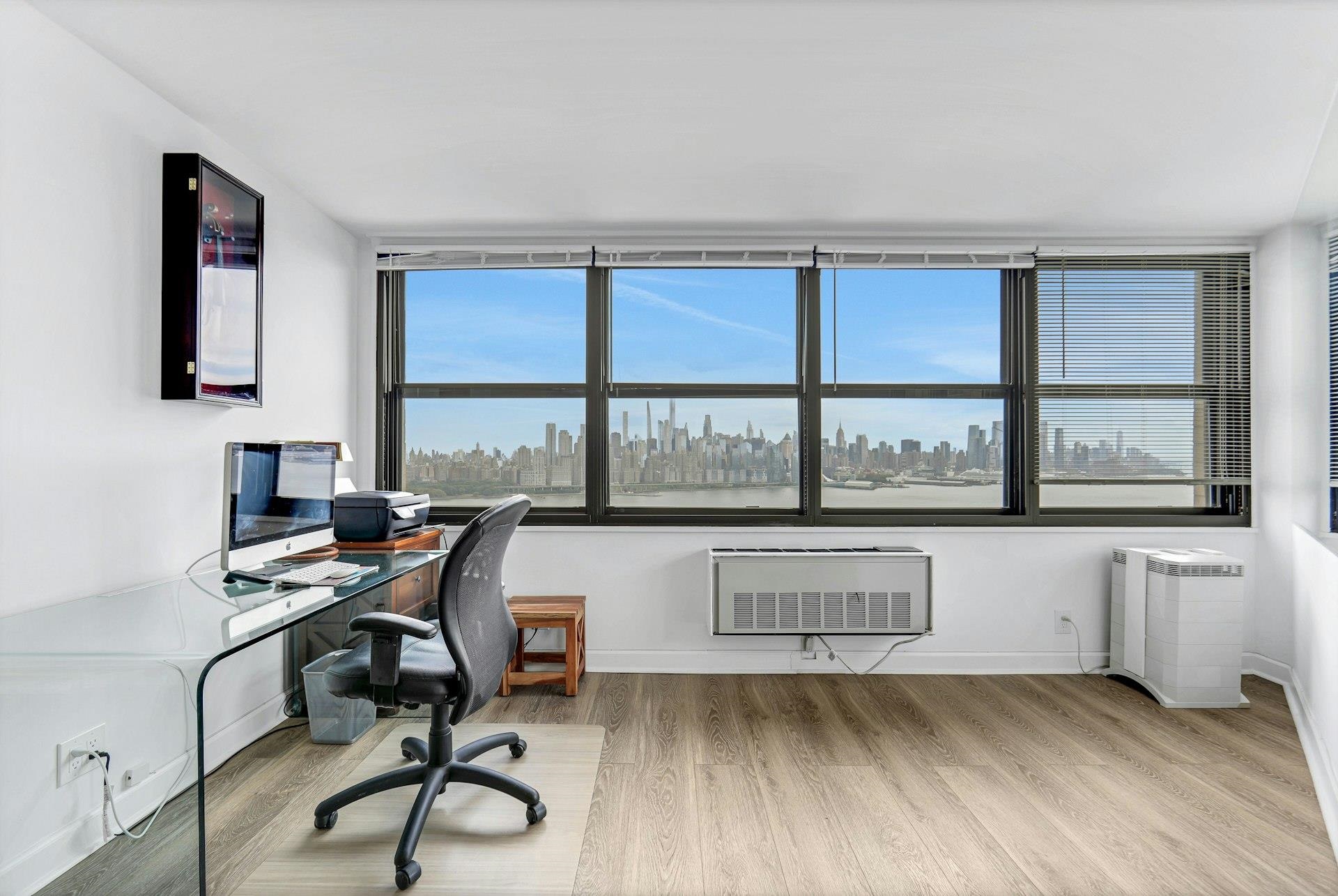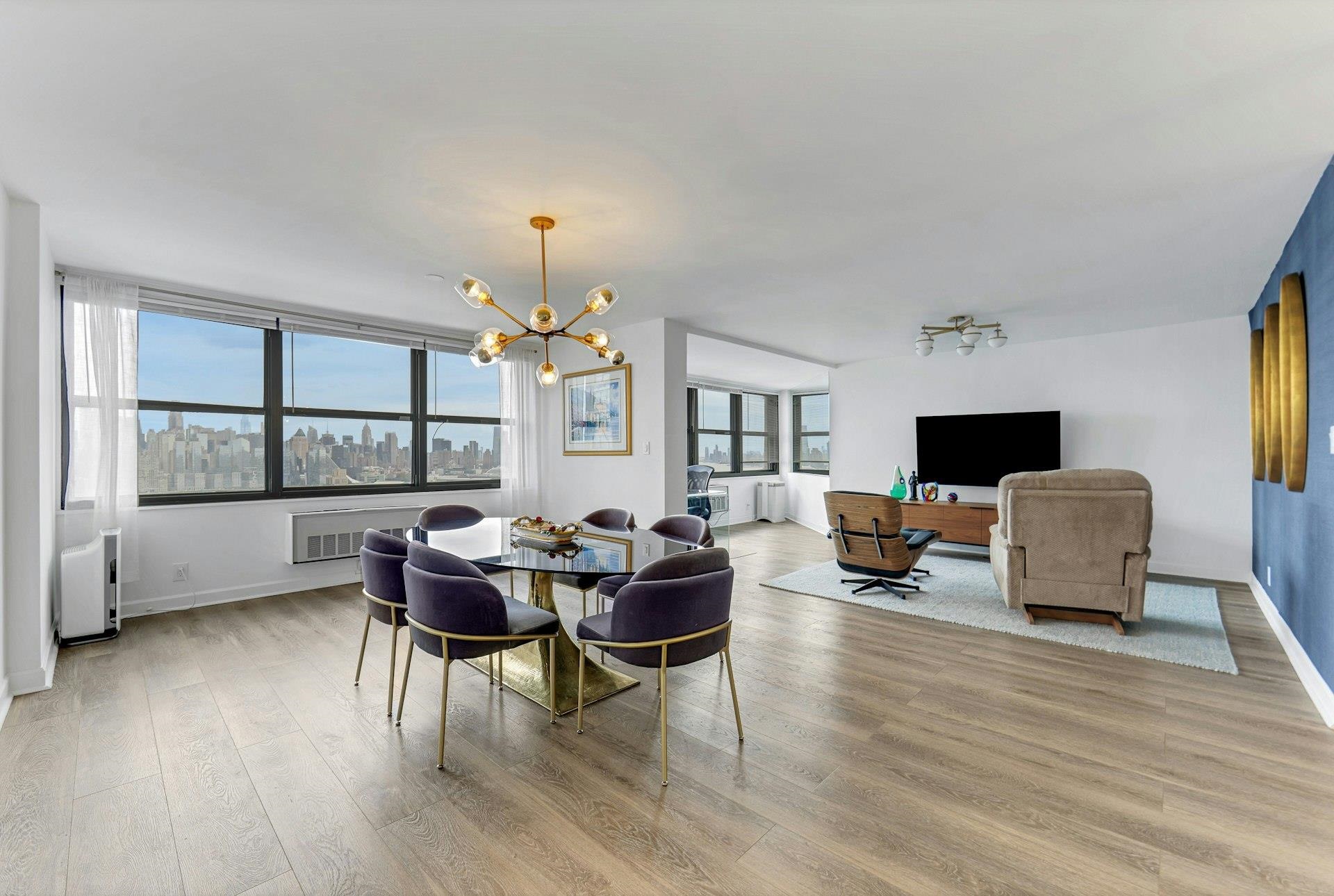 Experience luxury high-rise living at its finest in this beautifully renovated 2-bedroom, 2.5-bath residence at the iconic Galaxy Towers in Guttenberg, NJ. Boasting southeast exposure, this spacious unit is flooded with natural light and offers panoramic views of the Manhattan skyline and the Hudson River—visible from nearly every room. The thoughtfully updated interior features a modern open layout with generous living and dining areas, ideal for both everyday comfort and entertaining. The kitchen is equipped with sleek cabinetry, updated appliances, and ample storage. The original half bath has been transformed into a private jacuzzi room, creating a true spa-like retreat within your home. Both bedrooms are generously sized, with the primary suite offering an ensuite bath and ample closet space. Conveniences include laundry room on floor, EV charging in garage, on site shops and restaurants, and quick access to NYC via NY Waterway Ferry or NJ Transit Bus. Enjoy full-service amenities, including 24-hour concierge, indoor/outdoor pools, fitness center, tennis courts, game room, and children’s playroom. Maintenance fees include all utilities except cable and internet. Parking is available for $120/month.