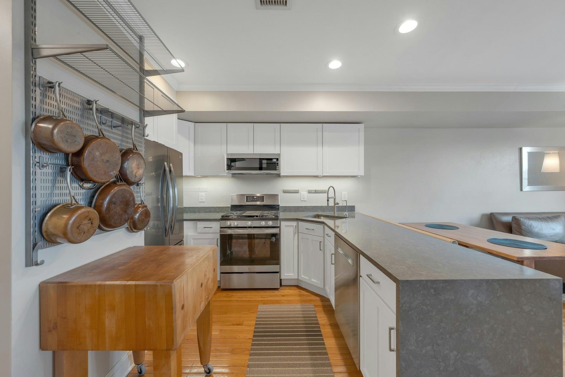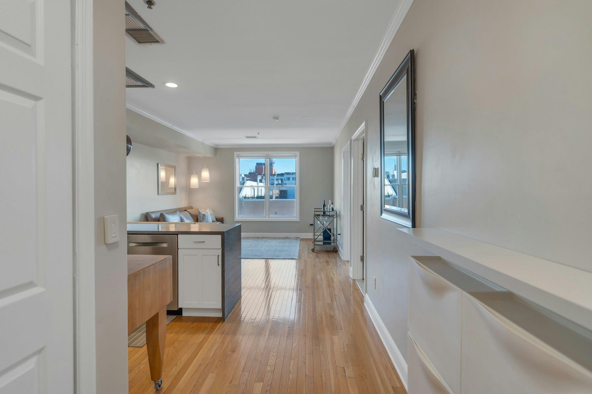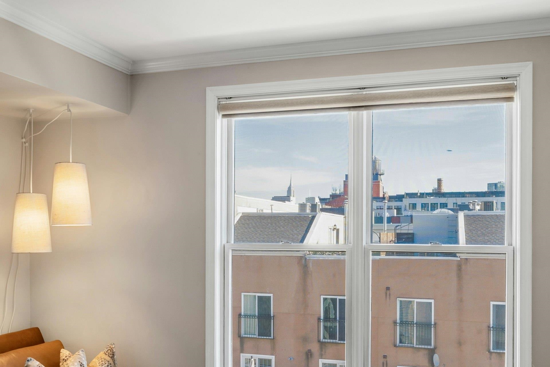 Sunny and bright Top-Floor Condo in an elevator building with Empire State Building views. Upgraded open kitchen includes waterfall quartz countertops and room for a dining room table! Ideal for entertaining. It is easy to park in the deeded parking space which has additional storage in front. Oversized bathroom and crown moldings complete this move-in-ready oasis. Charles Court owners enjoy a FULLY equipped exercise room. Recently upgraded Stainless steel appliances, new water heater and HVAC, and your own in home washer and dryer, make this a do not miss home.