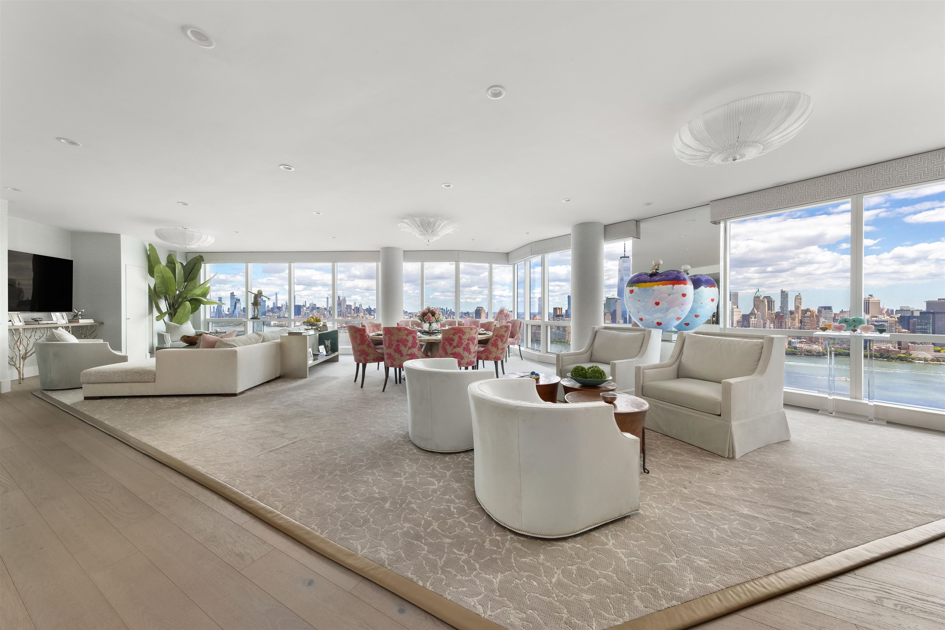 Introducing the epitome of luxury living! This exceptional combination penthouse situated atop the iconic Cetra Ruddy, 77 Hudson. The stunning glass curtain wall design provides unparalleled views of New York City, making it one of the most coveted locations in the world! This lavishly appointed 3,847 square foot home features 4 bedrooms, 4.5 bathrooms, and is meticulously designed with high-end finishes, including Sub-Zero, Miele, and Bosch appliances in two separate chef’s kitchens, elegant quartz countertops, luxurious spa-like baths adorned with Grecian and chiseled marble, custom California Closets, and Phillip Jeffries wallpaper throughout and an opulent dressing room that epitomizes the very definition of luxury. The Control 4 system offers smart home technology in every room, while Sonos speakers provide ambient music throughout, as well as one touch control of all lighting, climate and customized motorized window treatments. Upon entering, you’ll be captivated by the expansive main living room with floor-to-ceiling, wall-to-wall glass, offering breathtaking 180 degree views from the George Washington Bridge to the tip of Manhattan. The home is thoughtfully designed to accommodate a separate living area, perfect for a nanny’s suite or visiting relatives, complete with a second living room and kitchen. 77 Hudson also offers a plethora of amenities, including a 3,000 sq. ft. gym, pool, hot tub, sauna, steam room, children’s playroom, theatre room, game room, virtual golf, party room, and more. This exceptional home embodies urban sophistication at its finest. The Exchange Place waterfront has become one of Tri-State’s most desirable destinations with major developers like Tishman Speyer and Related Companies shaping its future skyline. It continues to evolve as a hub of luxury living and unmatched convenience, with the quickest commute to New York City from anywhere via ferry and PATH. This home is truly one-of-a-kind, and an opportunity not to be missed. There will truly never be another like it!