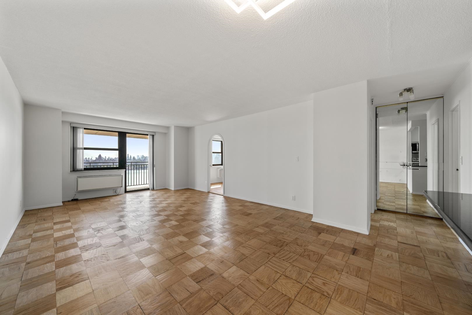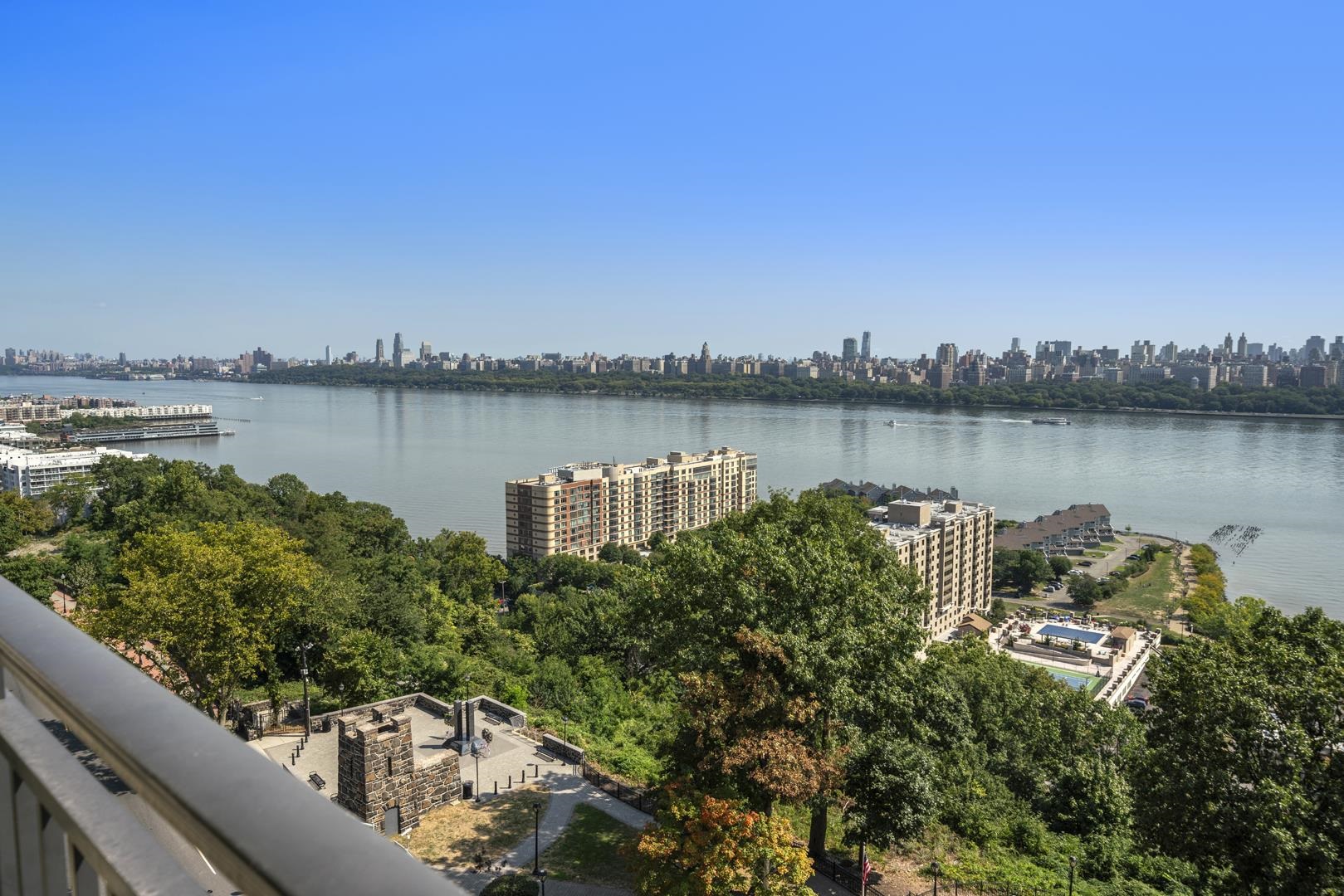 Spectacular Manhattan Skyline & Hudson River Views from Every Room! This beautifully upgraded 892 sq. ft. 1-bedroom + den/office in the desirable Parker Imperial offers breathtaking panoramic views from every window. The expansive living and dining area opens to a large covered balcony overlooking the Manhattan skyline and Hudson River—perfect for relaxing or entertaining. The open-concept kitchen features newer stainless steel appliances, granite counters, a breakfast bar, and abundant cabinetry. Other highlights include classic parquet wood floors throughout, excellent closet space, and an oversized bedroom with a huge walk-in closet plus a versatile den/office/guest space enclosed by sliding doors and separate entrance—ideal for working from home. The upgraded bathroom offers a luxurious rain shower. Located at 79th St. and Boulevard East, the Parker Imperial is a full-service luxury building with quick NYC access via bus or ferry. Building Amenities: 24-hour doorman & 24-hour garage attendant On-site fitness center New Myrtha outdoor pool with sun deck coming in 2026 New lobby renovation underway (2025) Laundry room on every floor (2 washers & 2 dryers per floor) Bicycle storage & package room Free tennis, pickleball & extensive recreational facilities in the adjacent 167-acre park with lake Transportation to NYC, Hoboken & Jersey City at your doorstep This home truly must be seen to be appreciated.