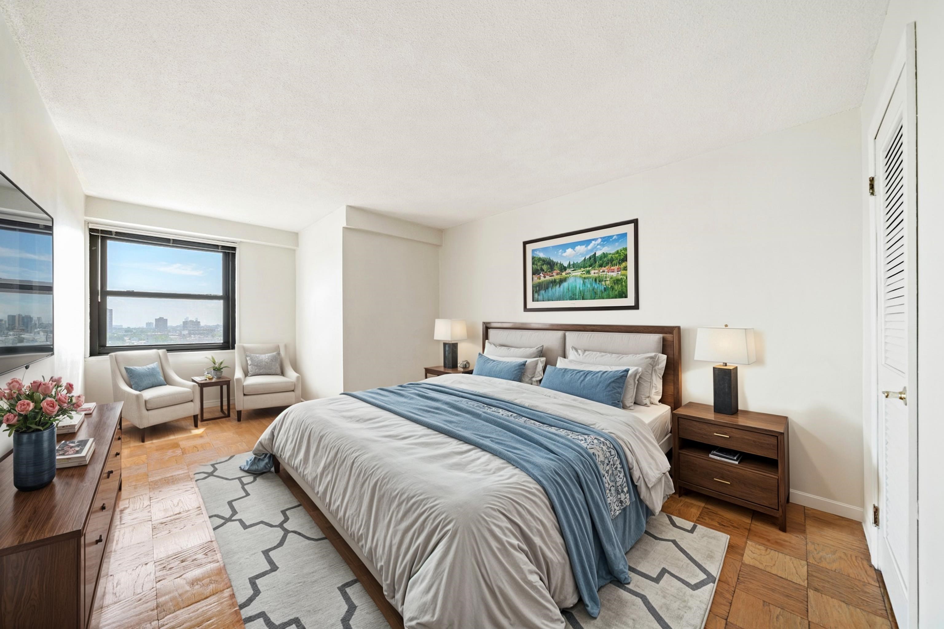 Parker Imperial Luxury Rental | Parking, Doorman, Pool & Gym Included. Spacious 781 sq. ft. 1-bedroom, 1-bath residence with spectacular Southeast NYC and Hudson River views from both the spacious living room and bedroom. Apartment Features: Stunning panoramic NYC & Hudson River views, Spacious living room and large bedroom with walk-in closet, Updated bathroom, Well-appointed kitchen with abundant cabinetry, dishwasher & stainless steel stove, Classic Parquet Hardwood floors throughout, Excellent closet space, Building & Area Amenities: 24-hour doorman & 24-hour garage attendant, On-site fitness center, Outdoor swimming pool with sun deck, Laundry room on every floor, On-site management, 1 assigned garage parking space, hot/cold water, pool & gym included in rent. Sorry, no pets. Location Highlights: Directly adjacent to James J. Braddock Park—167 acres with lake, free tennis & pickleball courts, and many recreational activities, Transportation to NYC at your doorstep—minutes to Manhattan by bus or ferry, Close to shopping, dining, and more