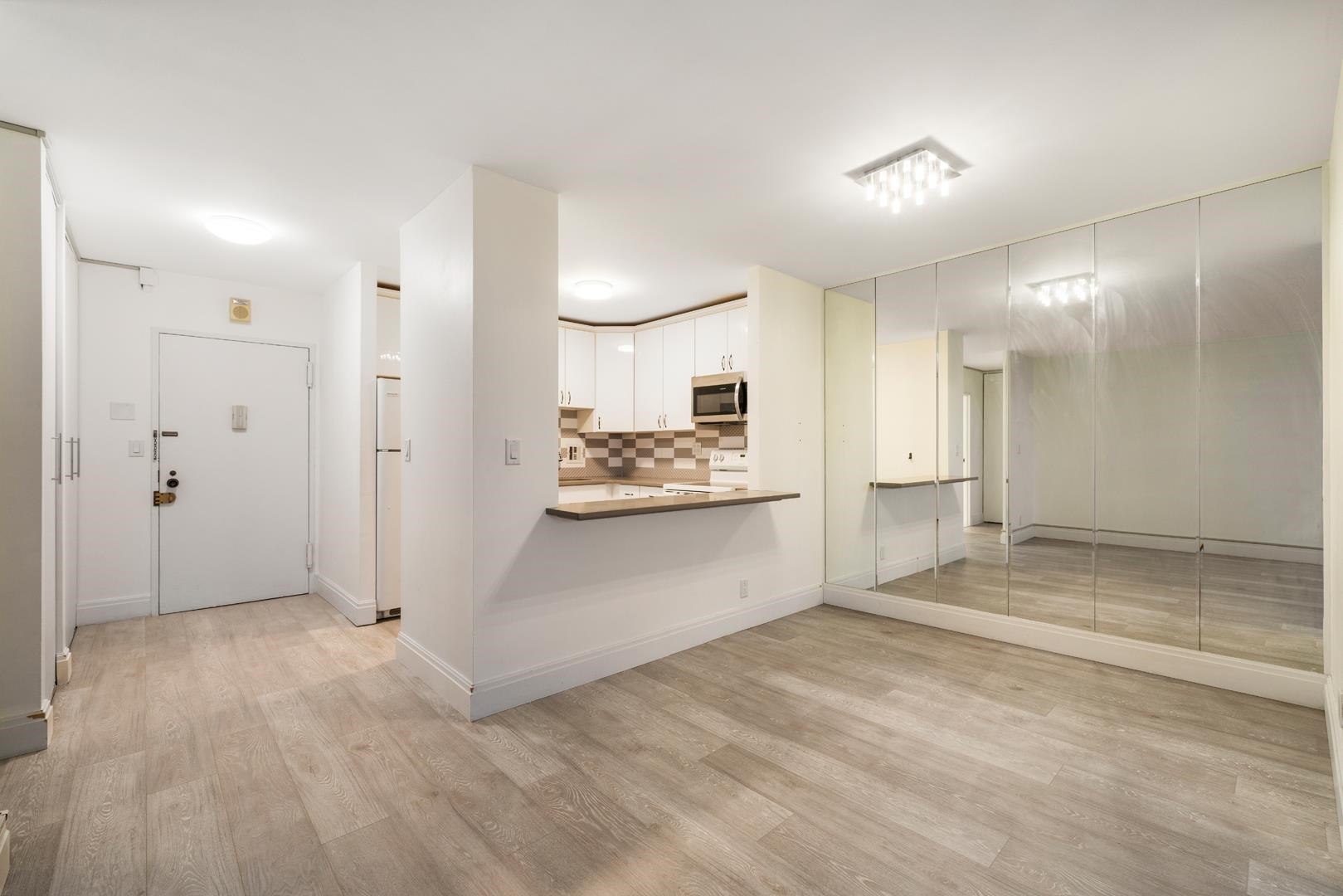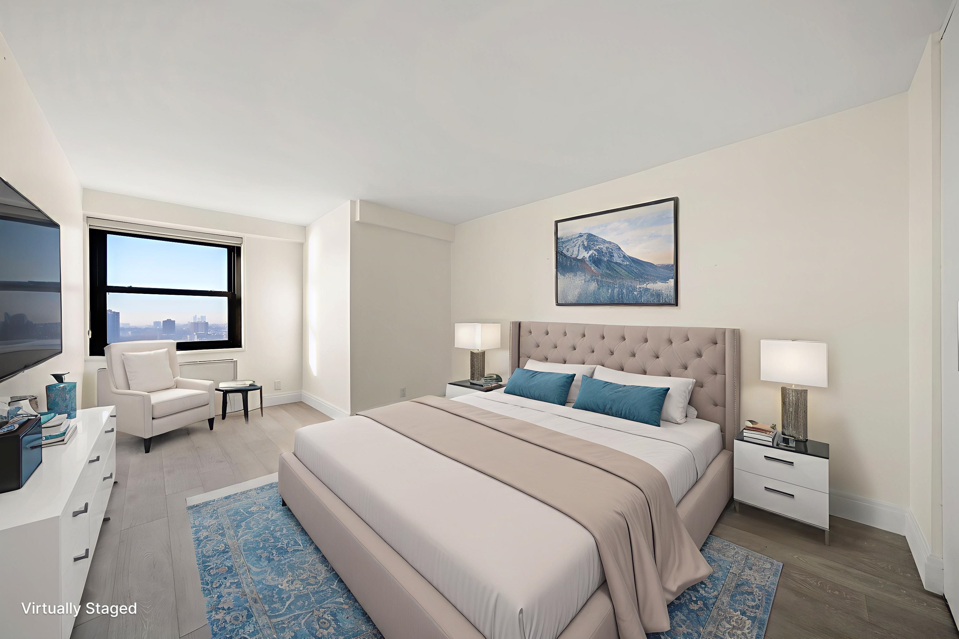 Come and enjoy living in this beautifully remodeled 1-bedroom condo with stunning Southeast NYC and Hudson River views at the Parker Imperial. Completely upgraded in 2018, this home offers a bright open-concept layout and modern finishes throughout. The spacious kitchen features a breakfast/serving bar, sleek modern white cabinetry, quartz countertops, white appliances, and a stylish two-tone backsplash. It opens seamlessly to the dining area and large living room—showcasing beautiful NYC views. The upgraded bathroom is generously sized and finished with quality fixtures, a modern vanity and lighting, elegant tile work, and a high-end glass shower door. Beautiful laminate floors run seamlessly throughout the home, complemented by upgraded lighting, window blinds, and abundant organized closet space. The large bedroom also features NYC and Hudson River views along with a walk-in closet. A must-see to truly appreciate! The Parker Imperial offers exceptional amenities, including a 24/7 doorman, fitness center, outdoor heated pool, and laundry facilities on every floor. Its prime North Bergen location borders a 167-acre park with a lake and free tennis/pickleball for residents, and provides easy access to transportation, shopping, and dining. Bus service to NYC, Hoboken, and Jersey City is conveniently located right at the door. Sorry no pets. Come for a tour while it’s still available!