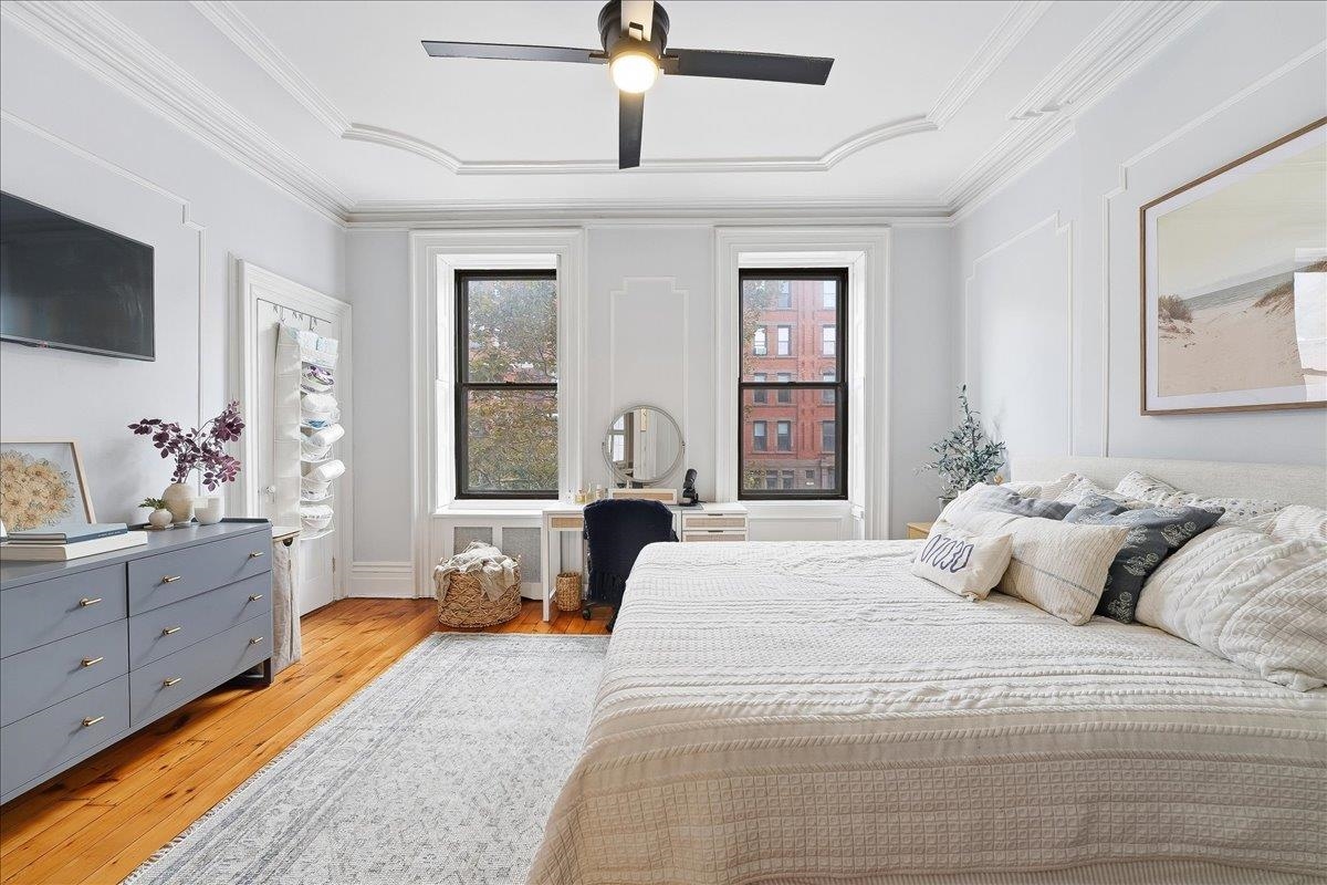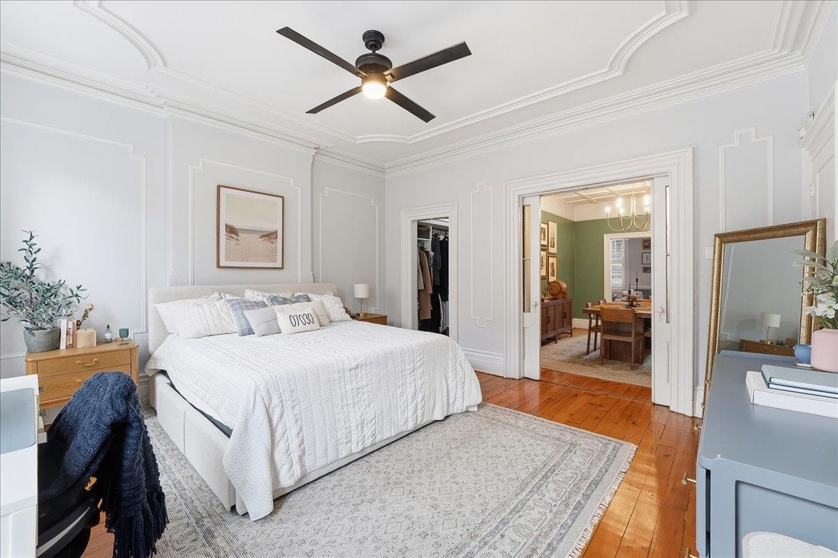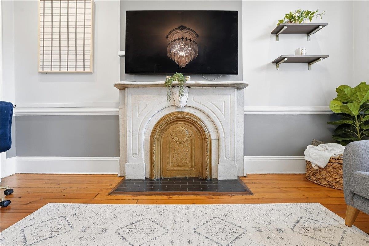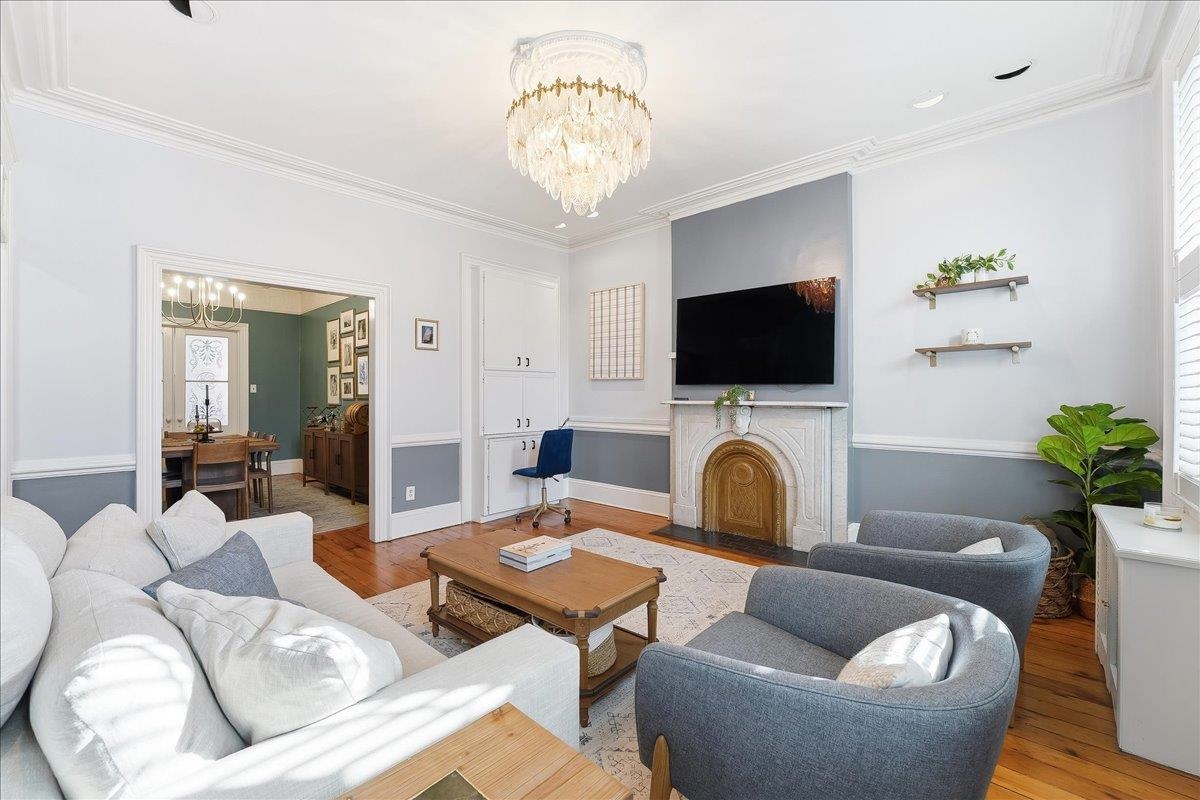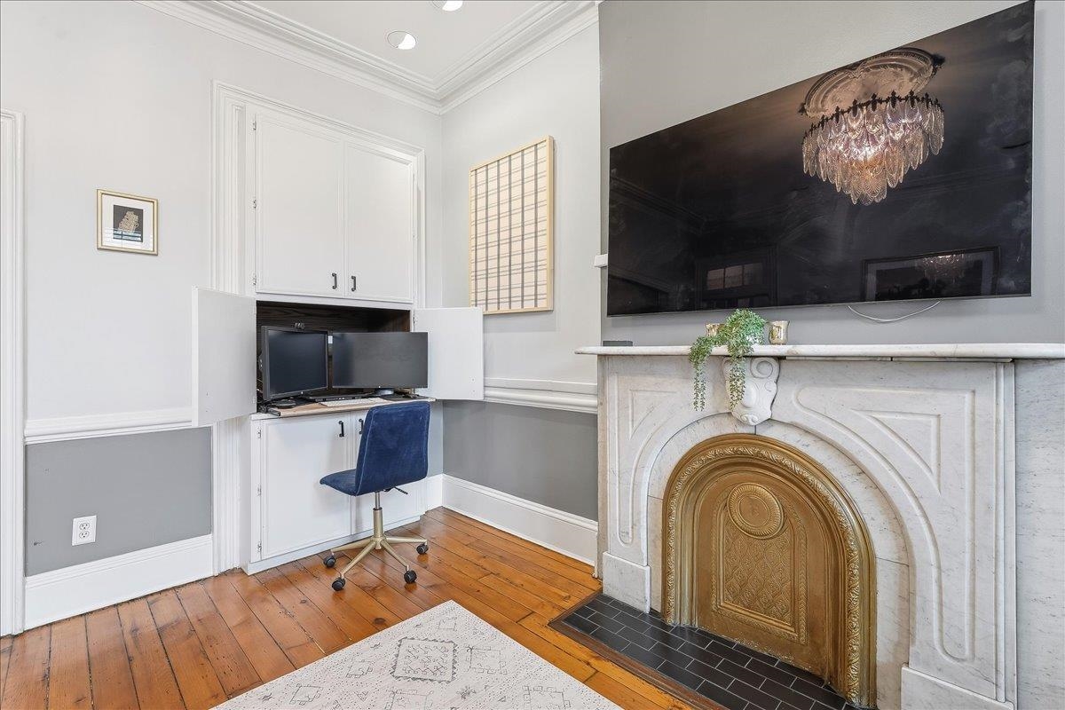 A unique opportunity to experience classic Hoboken charm with a chic modern flair in this designer-laden, one bed plus den loft style residence. Spanning the entire 2nd floor, Residence 2 is flooded with natural light from east to west and over 1,200 sqft. with 10′ high ceilings on vibrant Washington Street in Uptown. This incredibly bespoke home with stunning original pumpkin pine hardwood flooring & original prewar period details throughout, is only 1 short flight up, lending timeless architectural details with contemporary finishes. Relax in your spacious living room illuminated by stunning custom lighting, a decorative fireplace with a marble finish serves as a captivating centerpiece with a hidden office nook. Double wooden shutters, exquisite original crown moldings, stained glass & original etched glass pocket doors reflect the home’s refined character, while lofty ceilings create an airy, open feel. The kitchen features stone countertops, a pantry, and stainless steel appliances that can easily be opened up to the living room, perfect for any budding chef to host fabulous dinner parties. Retreat to the generously sized primary bedroom, complete with a huge walk-in closet, double wooden shutters for added privacy, and an adjacent den—ideal as a home office, nursery or gym and can be converted to a bathroom, laundry room or add’l walk-in! Rounding out this unique home is a full sized laundry & massive extra storage in the basement! Perfectly situated just moments from iconic restaurants, boutique shops, lush parks, and easy transportation via the 126 bus right outside your door to NYC, this home offers the ultimate in urban sophistication and luxurious city living.
