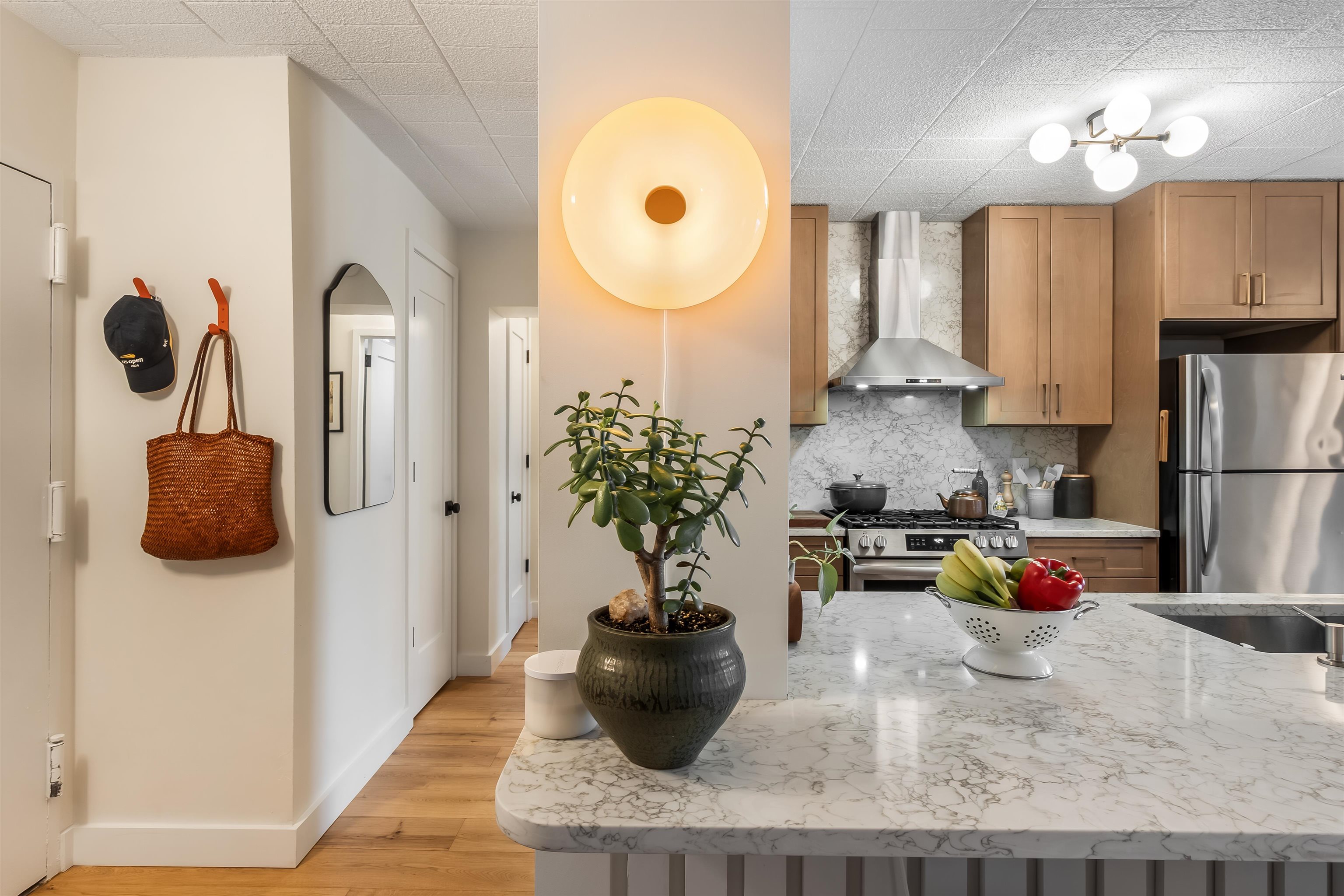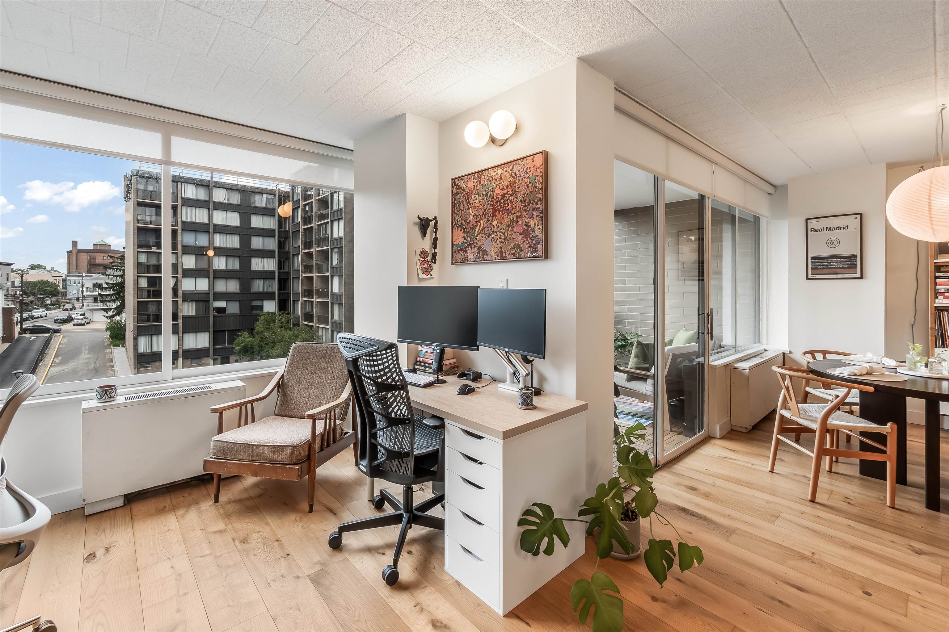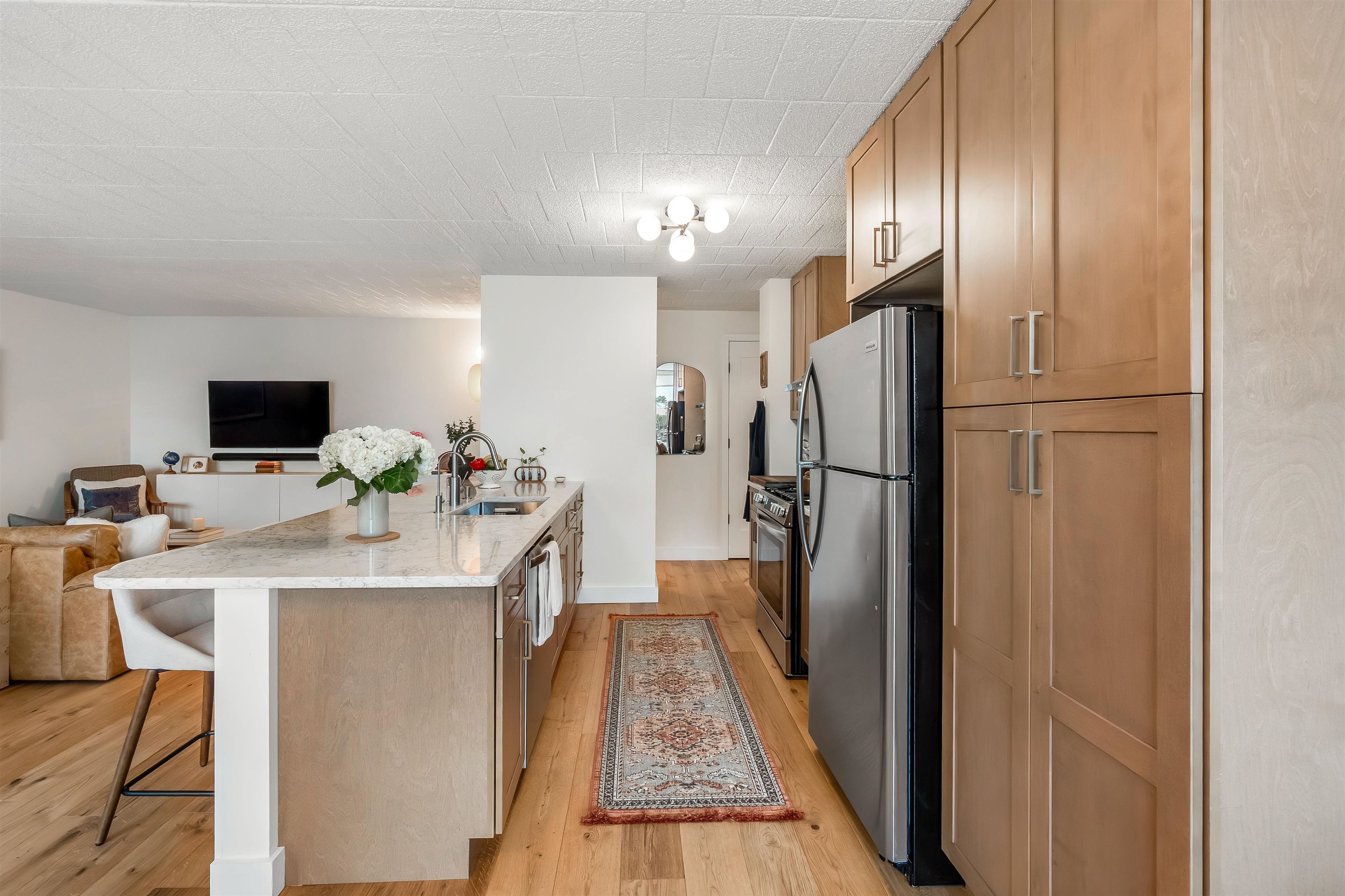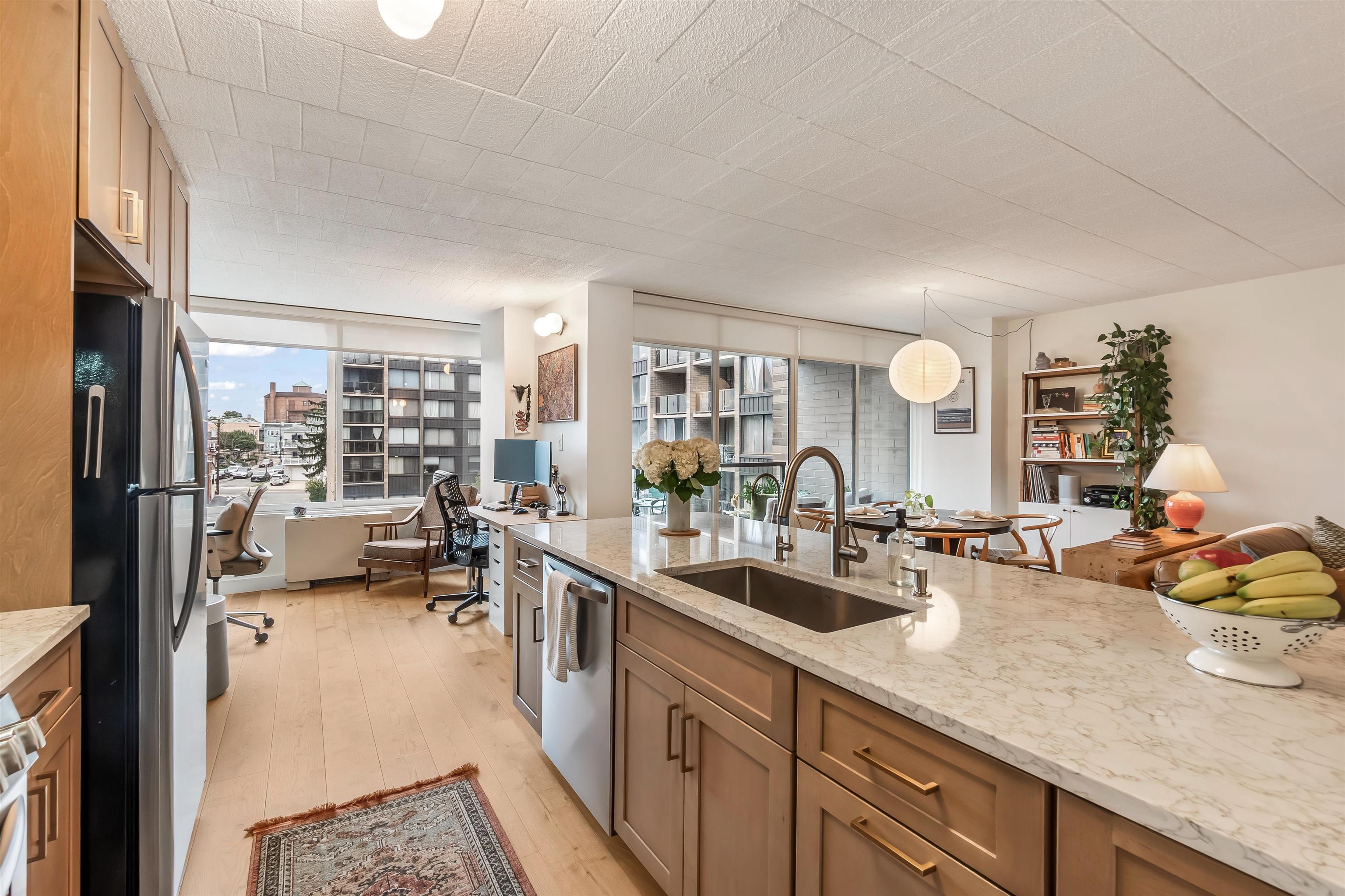 Beautifully Renovated Oversized 1-Bedroom at The Park Hudson Condominiums. Welcome to this stunning, newly renovated one-bedroom, one-bathroom home in the highly sought-after Park Hudson Condominiums. Fully move-in ready, this residence offers refined finishes and a thoughtful layout designed to impress even the most discerning buyer. The chef-inspired kitchen is perfect for both cooking and entertaining, featuring updated stainless steel appliances, designer cabinetry, and a generous kitchen island with sleek quartz countertops. The open-concept floor plan flows seamlessly into a spacious living and dining area, providing plenty of room for relaxation or a dedicated work-from-home space. Throughout the home, you’ll find wide plank flooring, elegant custom baseboards and millwork, and an abundance of natural light. Step out onto your private balcony, ideal for morning coffee or al-fresco dining with friends. The primary bedroom includes a custom walk-in closet with ample storage, while the spa-like bathroom features a walk-in shower, floor-to-ceiling tile, and a modern vanity with marble top. Residents of The Park Hudson enjoy a full suite of amenities, including a 24-hour concierge, fitness center, on-site laundry facilities, and an outdoor swimming pool with breathtaking views of the New York City skyline. All utilities and use of amenities are included in the monthly HOA fee, and on-site parking is available for rent at just $125 per month. Ideally located just steps from NYC transportation (approximately 30 minutes to Manhattan), James J. Braddock Park, and a diverse selection of restaurants, cafés, and shops, this home perfectly combines luxury, convenience, and lifestyle. Don’t miss this rare opportunity to own a beautifully updated home in one of North Bergen’s premier buildings.