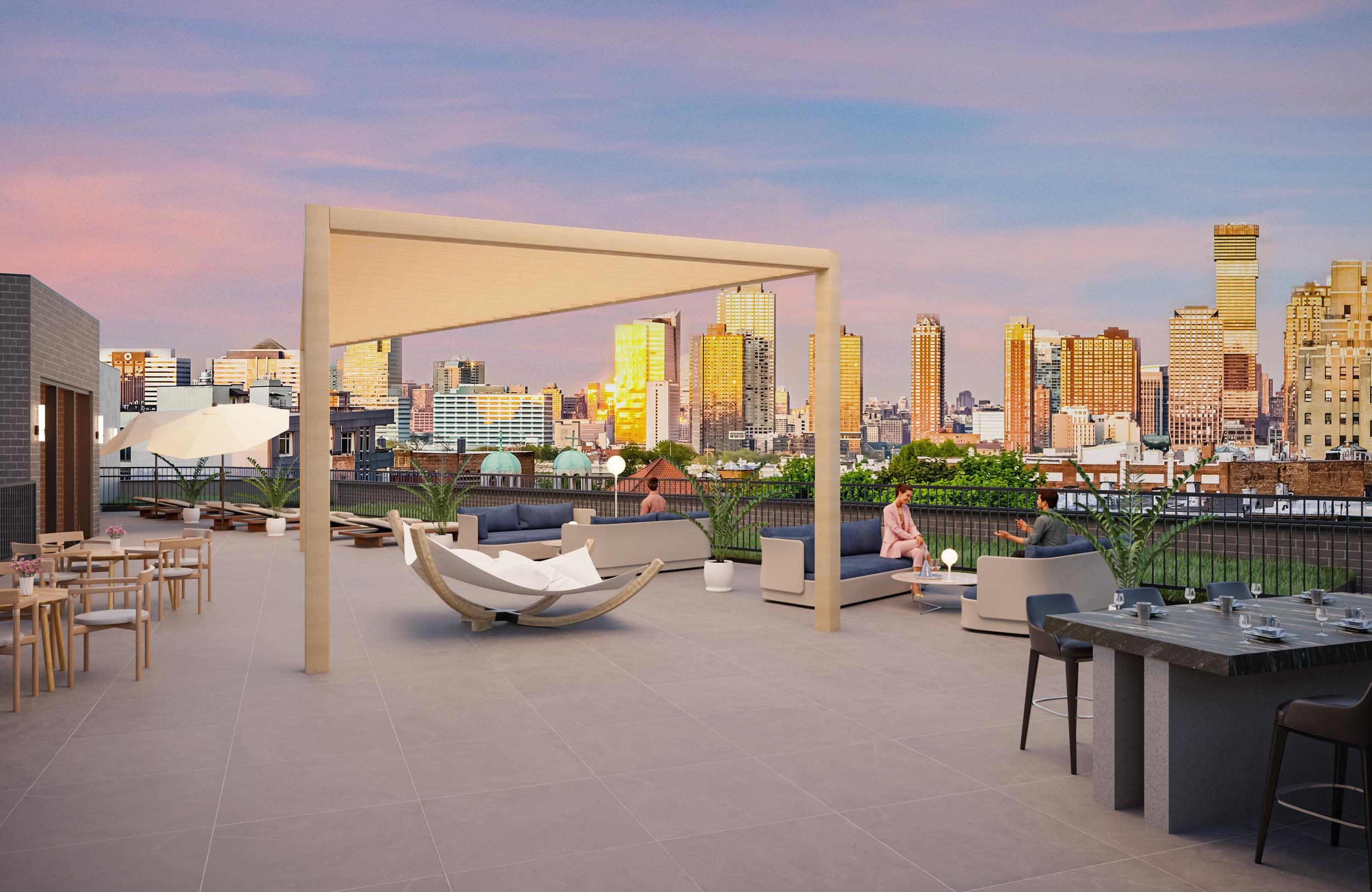 99 storms is a 50-unit luxury rental residence is ready to exceed all your expectations. Its efficient, contemporary design emphasizes quality craftsmanship and comfort. – – – Roomy interiors with striking finishes, Montauk-style flooring and expansive black framed oversized windows that allow for plenty of natural light set the tone for these appealing apartments. – – – Smartly designed kitchens are complete with custom cabinetry enhanced by white Quartz waterfall countertops and continuous slab backsplash, integrated with full size premium stainless-steel appliances. – – – Bathrooms are outfitted with Porcelanosa tiling, dark gray flooring and large Carerra marble wall tile, completed with chrome sinks and fixtures. Every residence includes an in-unit washer-dryer while select apartments are enhanced by outdoor spaces. – – – Thoughtfully curated amenities complement these fine residences including a residents’ lounge with kitchenette; a co-working lounge for a convenient home office setup, and a state of the art fitness center including a weightlifting area and yoga room. A fully furnished roof deck allows residents to enjoy time outside hanging and grilling with panoramic views of Jersey City and beyond. Other essentials include a bike storage room and lower-level storage available for a fee. – – – Located in McGinley Square, a lively micro-neighborhood within Journal Square that’s affectionately known as the “heart” of Jersey City, 99 Storms represents your modern lifestyle.